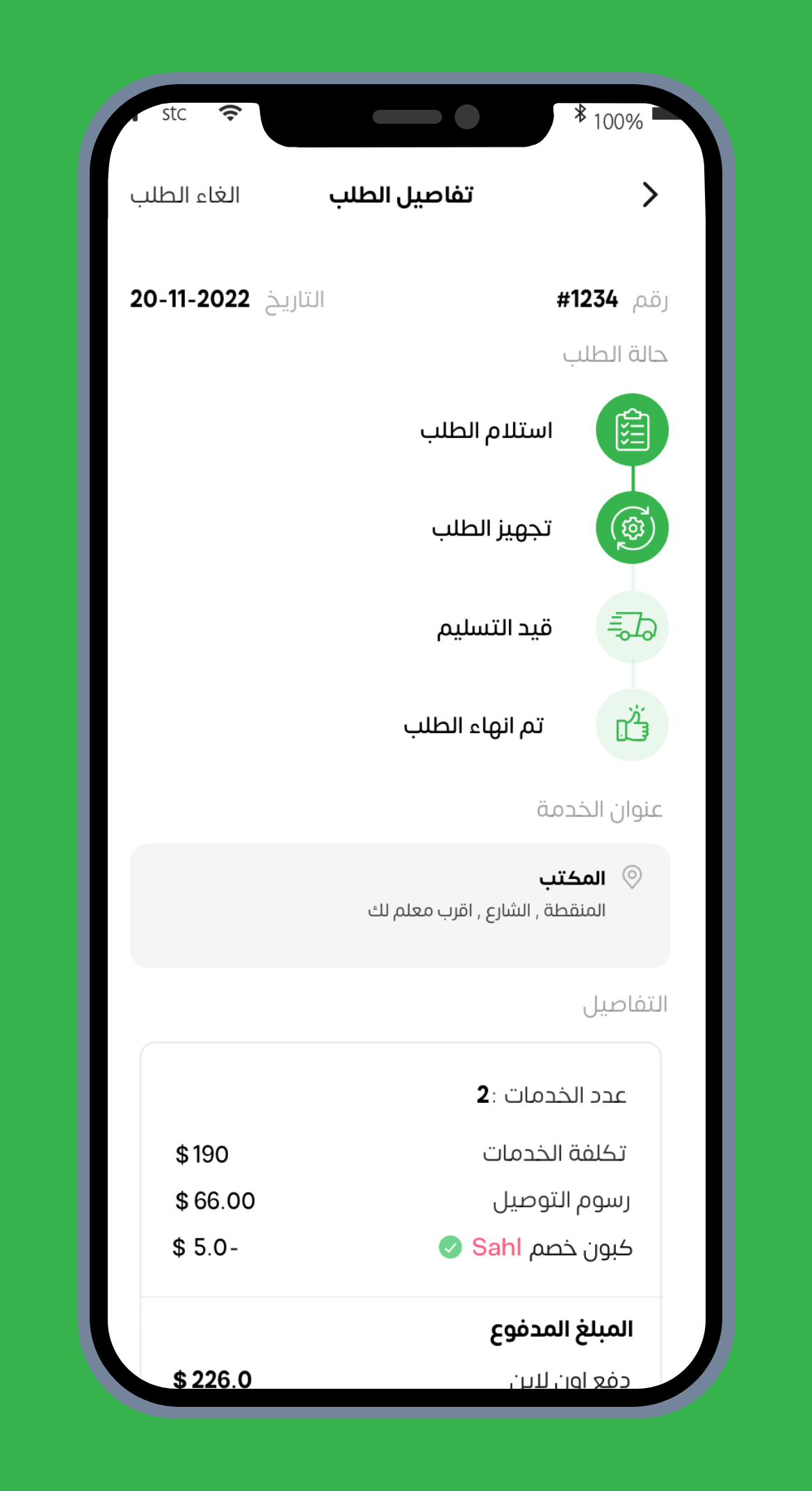 يمكنك عرض ومتابعة حالة الطلب بكل سهولة من قائمة طلباتي او الغاء الطلب او تقديم شكوى